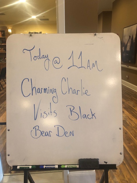 We went to Jasper, and we were greeted by my friend Scott’s mother, Pat. There she was in her wheel chair to take us in to meet the director. We introduced Charlie to the director and staff. We toured the facility, and met some of the residents. We made sure they knew Charlie was “training” to be a therapy dog, and was not certified. They asked that we bring his shot records, and then give them a copy of each diploma that he earned. Mike, Charlie, and I were instantly in love with the Assisted Living Center, the staff and the residents. We started the next Monday at 11 AM, in the Black Bear Den, and Memory Care. We made private visits to residents in their rooms who for one reason or another were unable to leave and join the large group meeting with Charlie. Isn’t God Amazing!!!! He opened a door that I would have never opened, HE helped me overcome my fears, and allowed this to be a ministry that my husband and I would do together. Oh and by the way, the residences call him “Charming Charlie”.